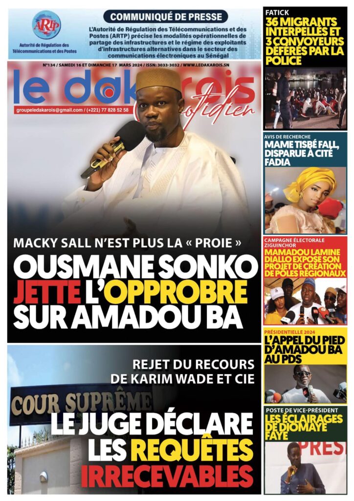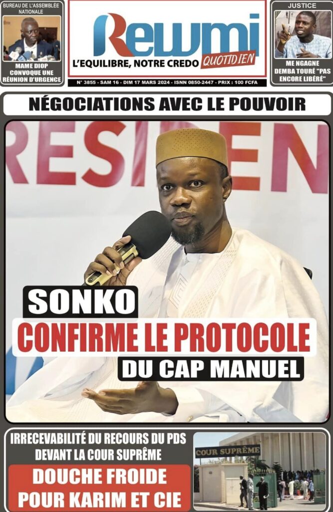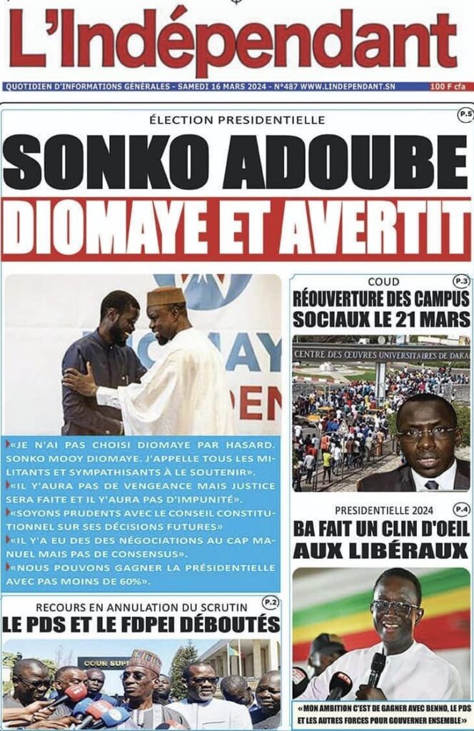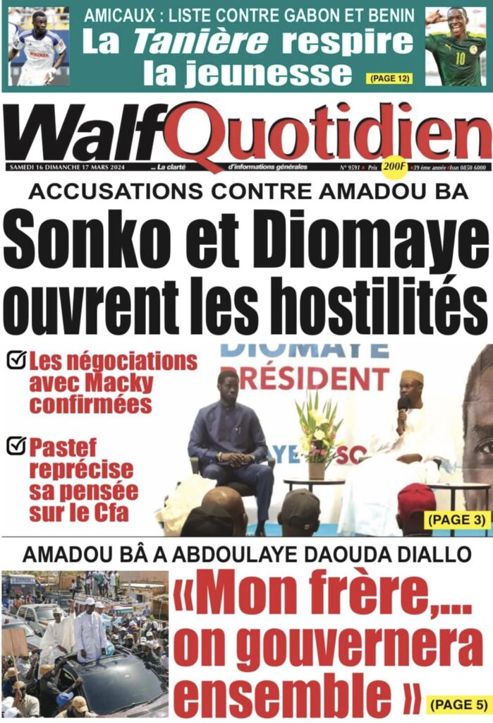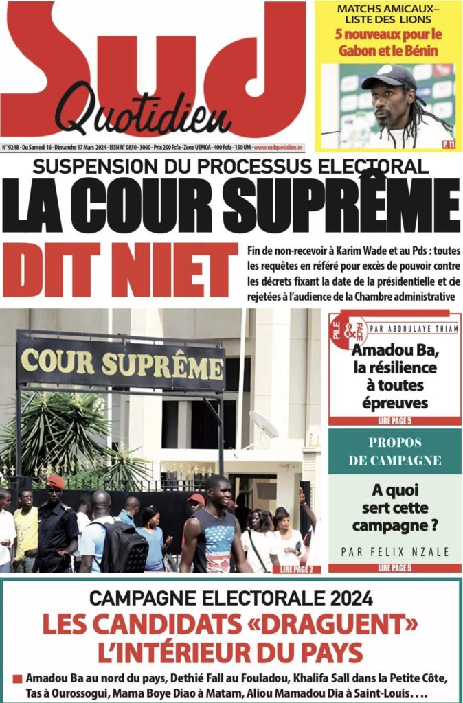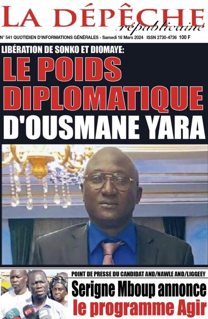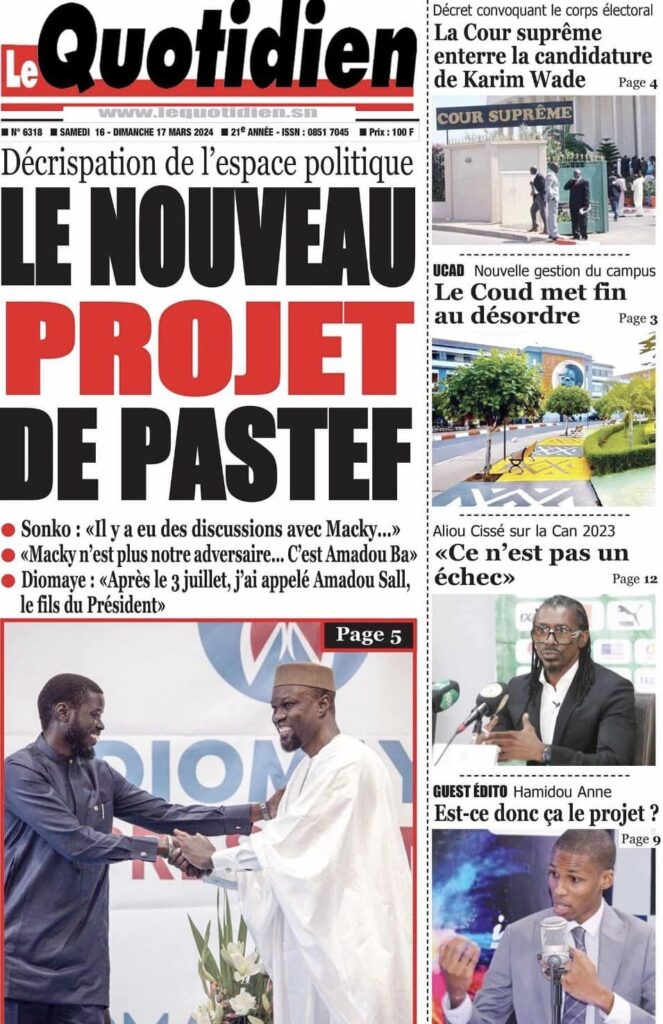 Accueil › Sénégal › Une des journaux du samedi 16 mars 2024 Une des journaux du samedi 16 mars 2024 Publié le 16 Mar 2024, à 05:58 par Abdou Faty GUEYE Une des journaux du samedi 16 mars 2024 Votre avis sera publié et visible par des milliers de lecteurs. Veuillez l’exprimer dans un langage respectueux. Commentaire Nom E-mail (ne sera pas visible) Enregistrer mon nom, mon e-mail et mon site web dans le navigateur pour mon prochain commentaire. Partager Partager Partager 0 Laisser un commentaire Annuler la réponseCommentaireNom E-mail (ne sera pas visible) Enregistrer mon nom, mon e-mail et mon site dans le navigateur pour mon prochain commentaire.