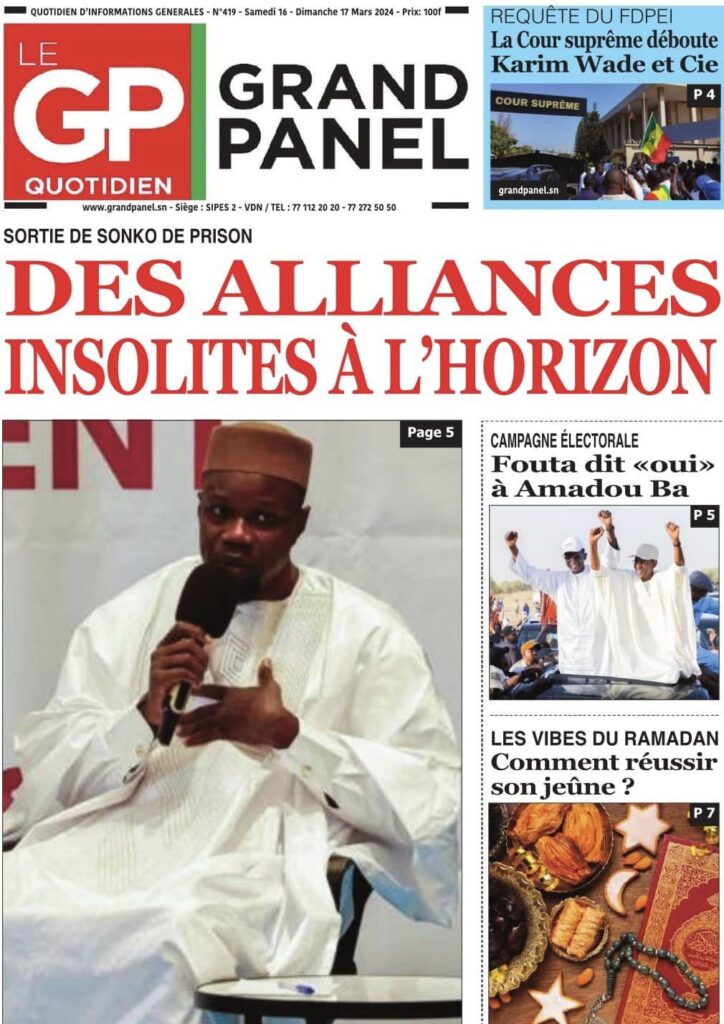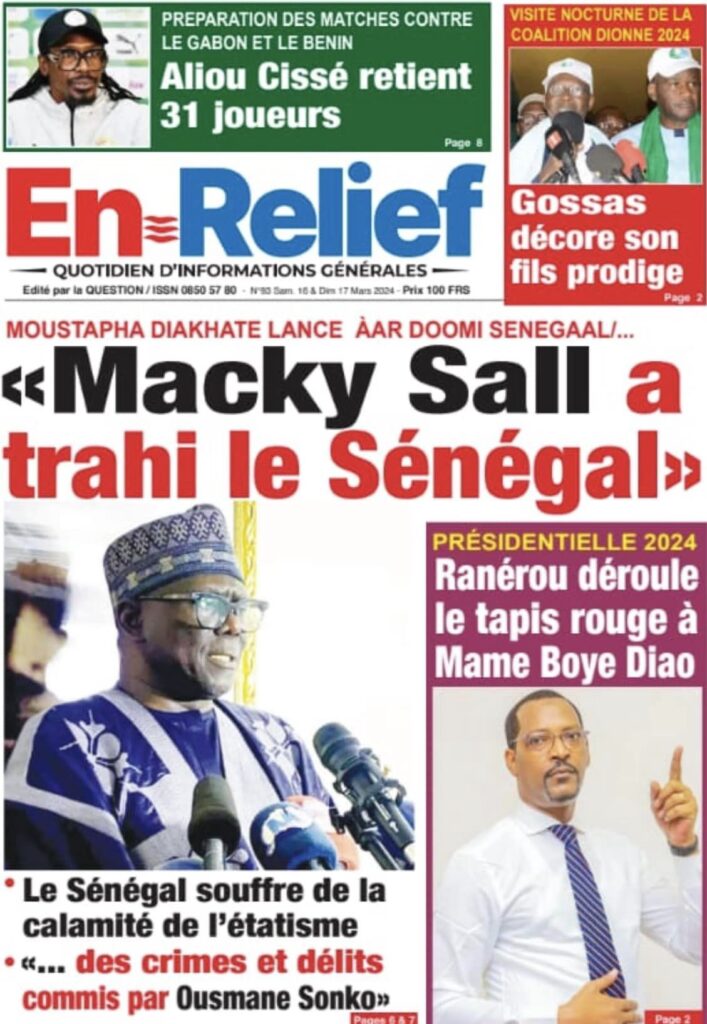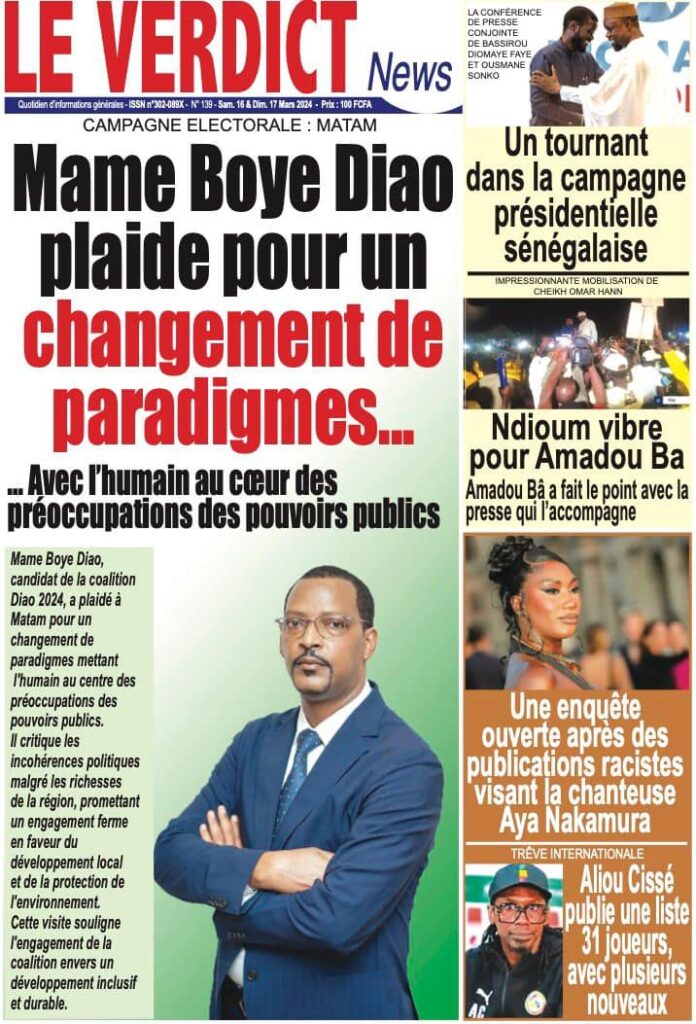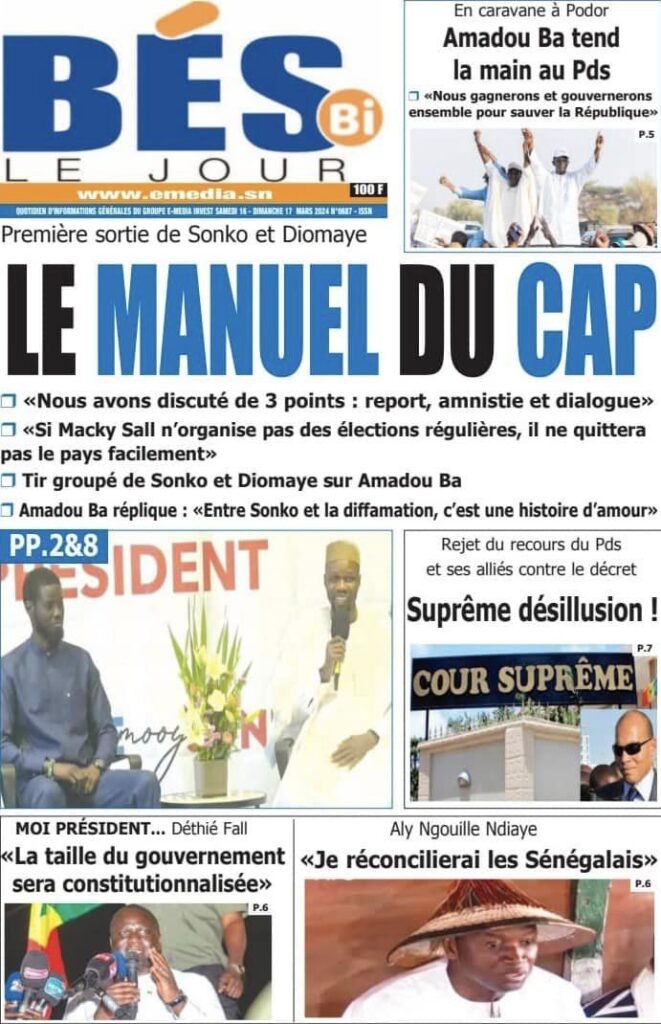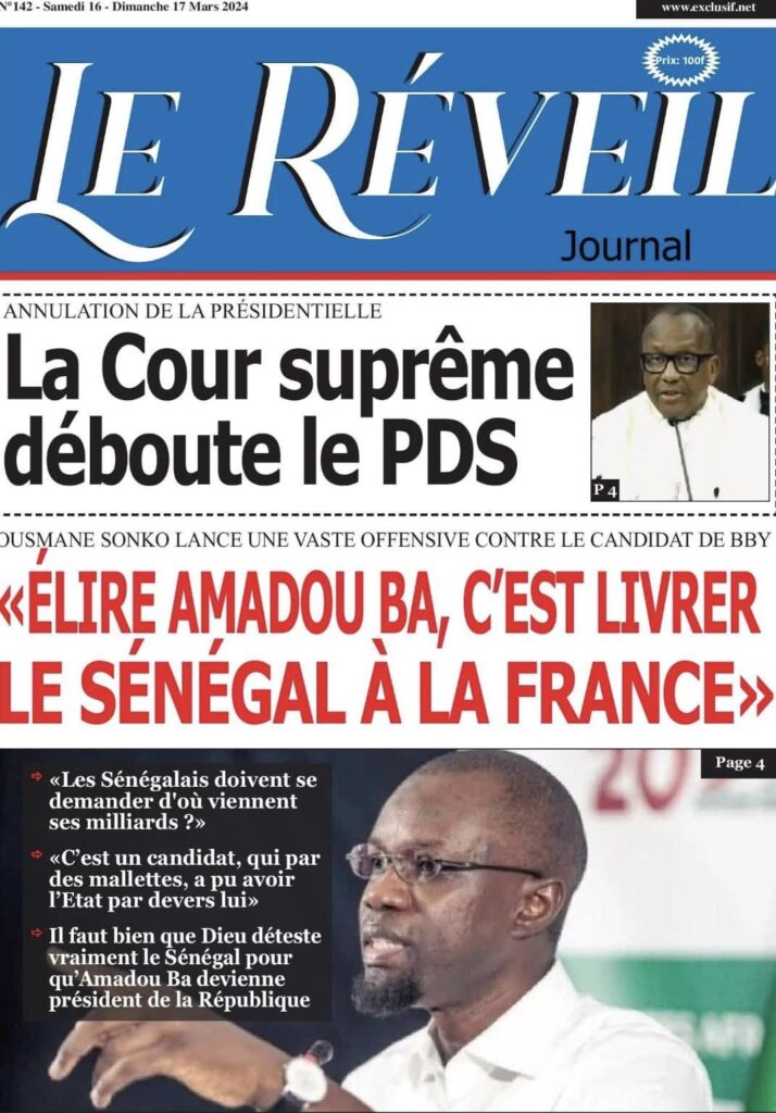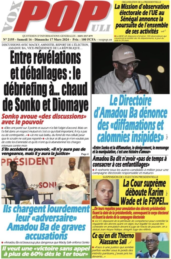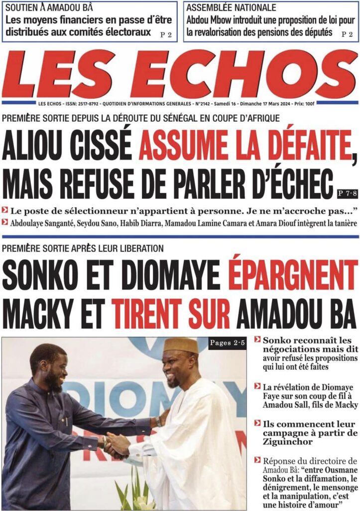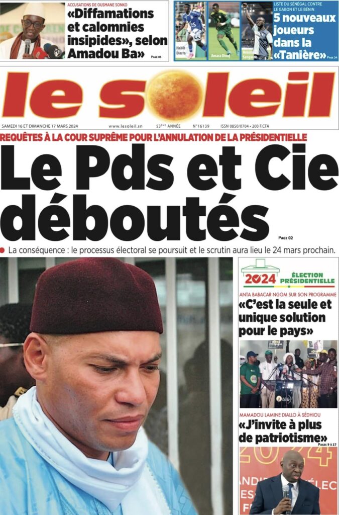 Accueil › Sénégal › Une des journaux du samedi 16 mars 2024 Une des journaux du samedi 16 mars 2024 Publié le 16 Mar 2024, à 05:58 par Abdou Faty GUEYE Une des journaux du samedi 16 mars 2024 Votre avis sera publié et visible par des milliers de lecteurs. Veuillez l’exprimer dans un langage respectueux. Commentaire Nom E-mail (ne sera pas visible) Enregistrer mon nom, mon e-mail et mon site web dans le navigateur pour mon prochain commentaire. Partager Partager Partager 0 Laisser un commentaire Annuler la réponseCommentaireNom E-mail (ne sera pas visible) Enregistrer mon nom, mon e-mail et mon site dans le navigateur pour mon prochain commentaire.