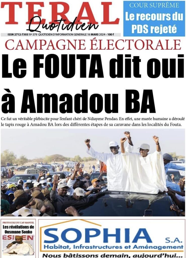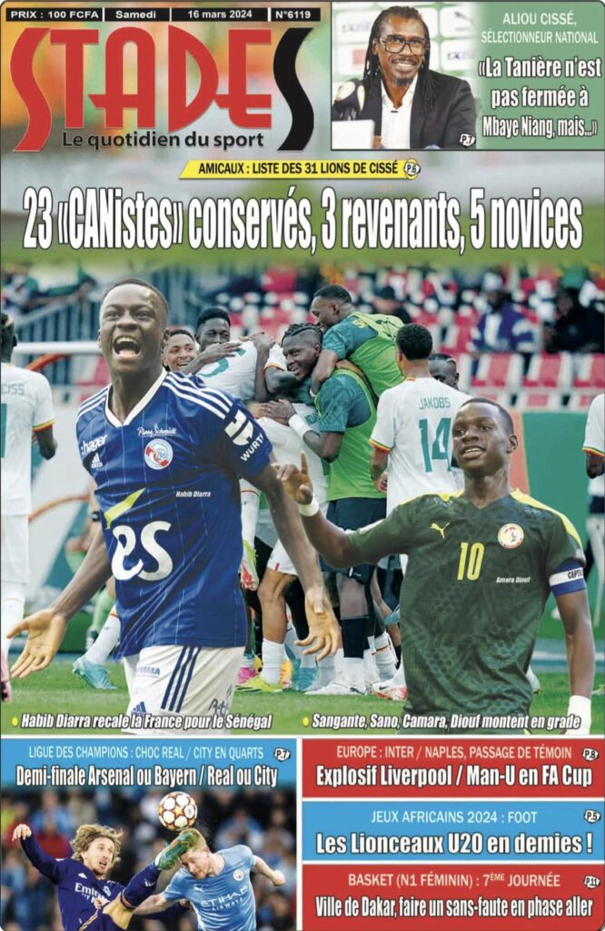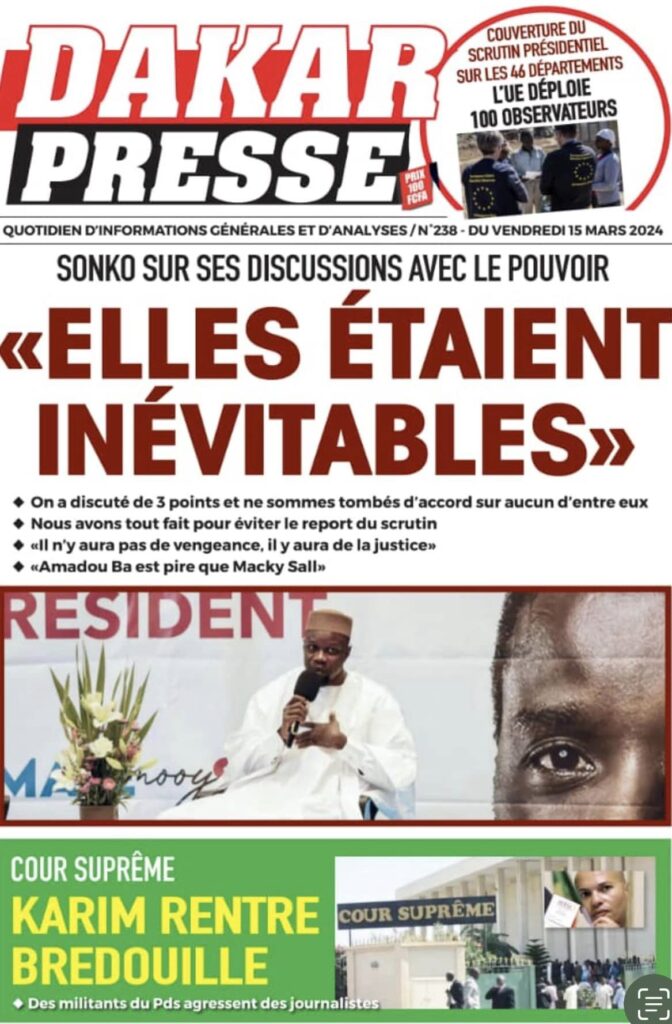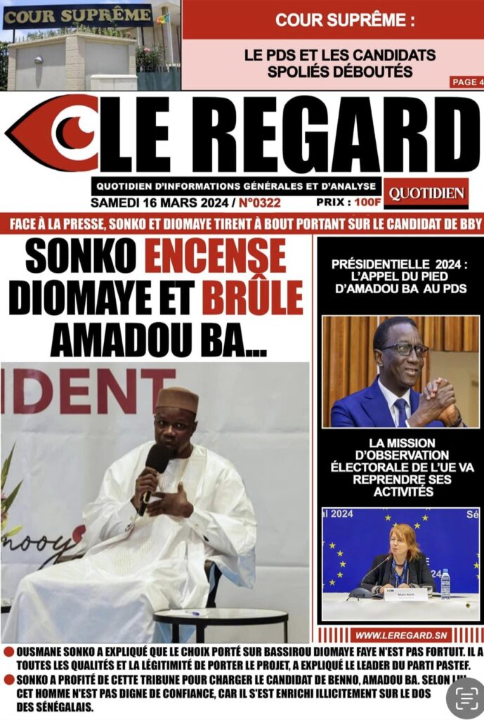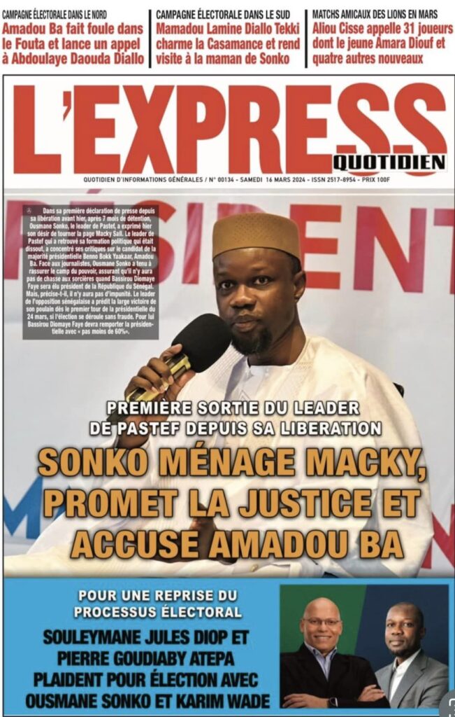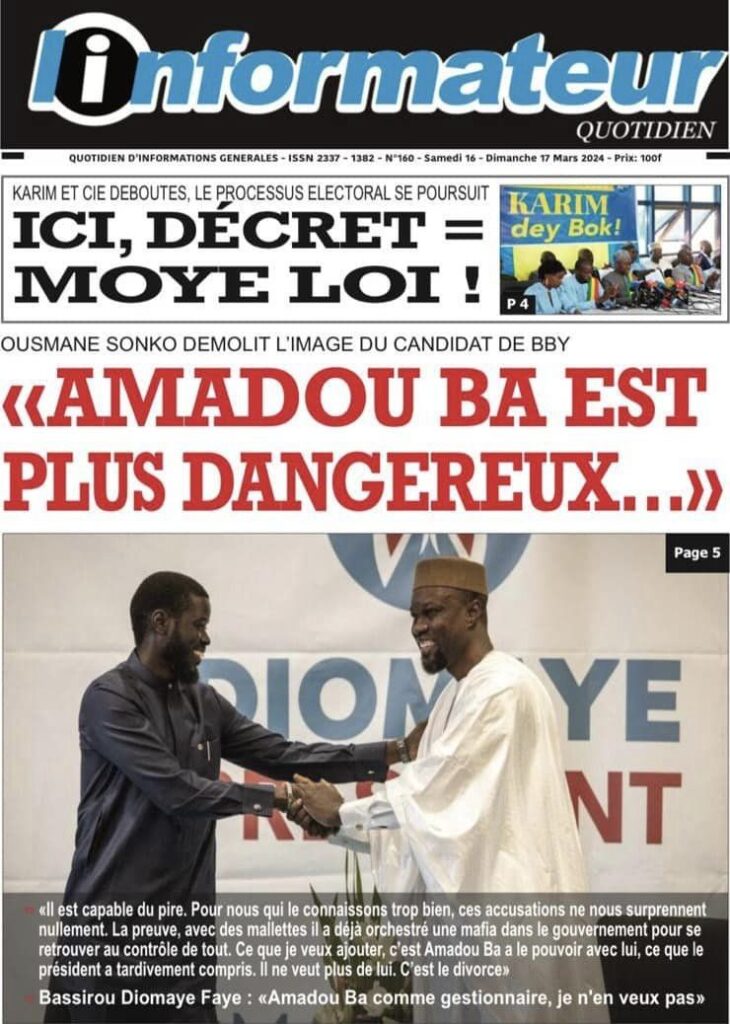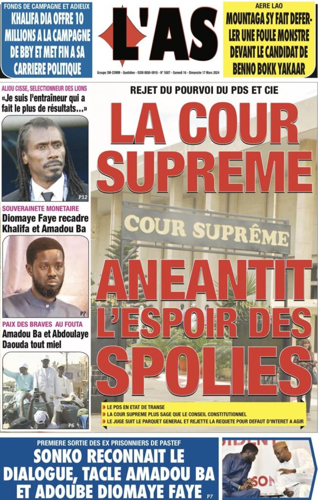 Accueil › Sénégal › Une des journaux du samedi 16 mars 2024 Une des journaux du samedi 16 mars 2024 Publié le 16 Mar 2024, à 05:58 par Abdou Faty GUEYE Une des journaux du samedi 16 mars 2024 Votre avis sera publié et visible par des milliers de lecteurs. Veuillez l’exprimer dans un langage respectueux. Commentaire Nom E-mail (ne sera pas visible) Enregistrer mon nom, mon e-mail et mon site web dans le navigateur pour mon prochain commentaire. Partager Partager Partager 0 Laisser un commentaire Annuler la réponseCommentaireNom E-mail (ne sera pas visible) Enregistrer mon nom, mon e-mail et mon site dans le navigateur pour mon prochain commentaire.
