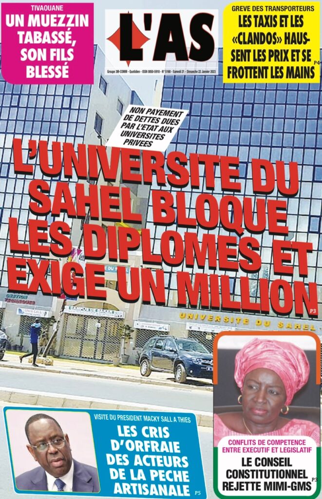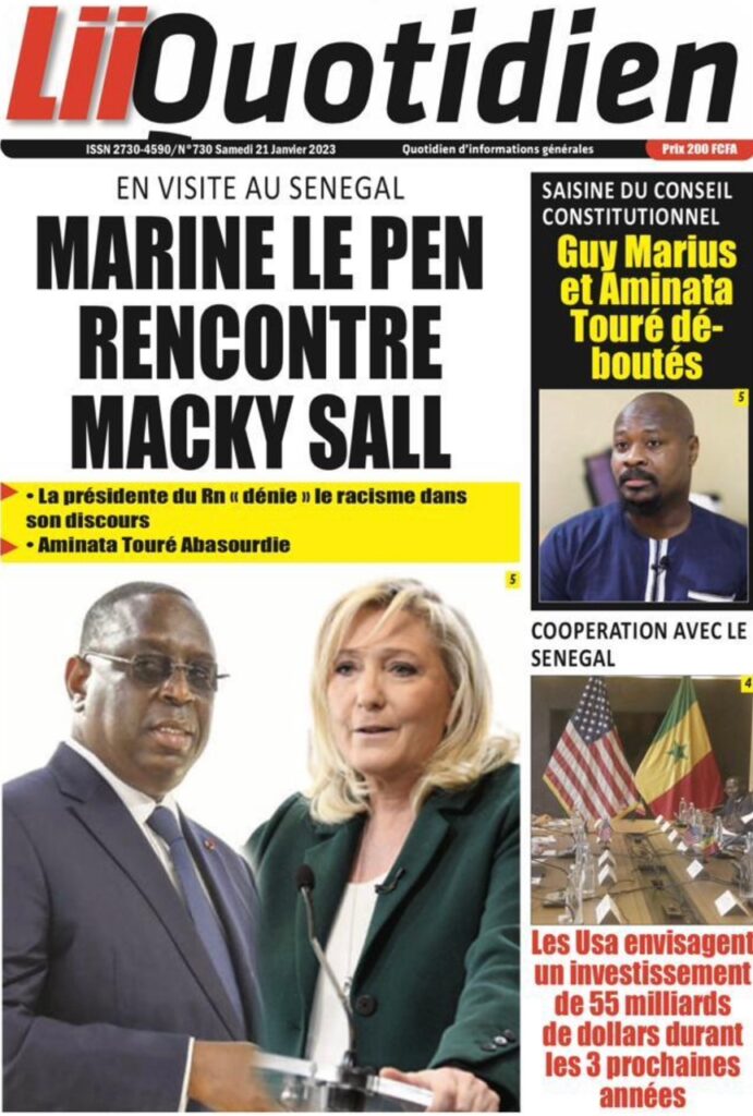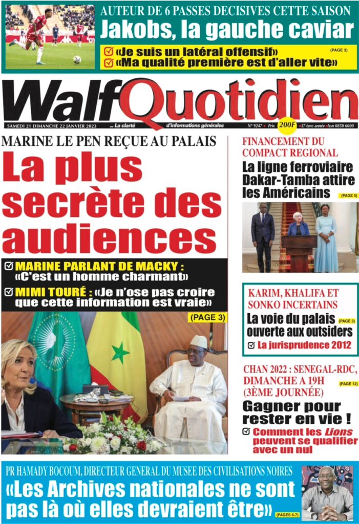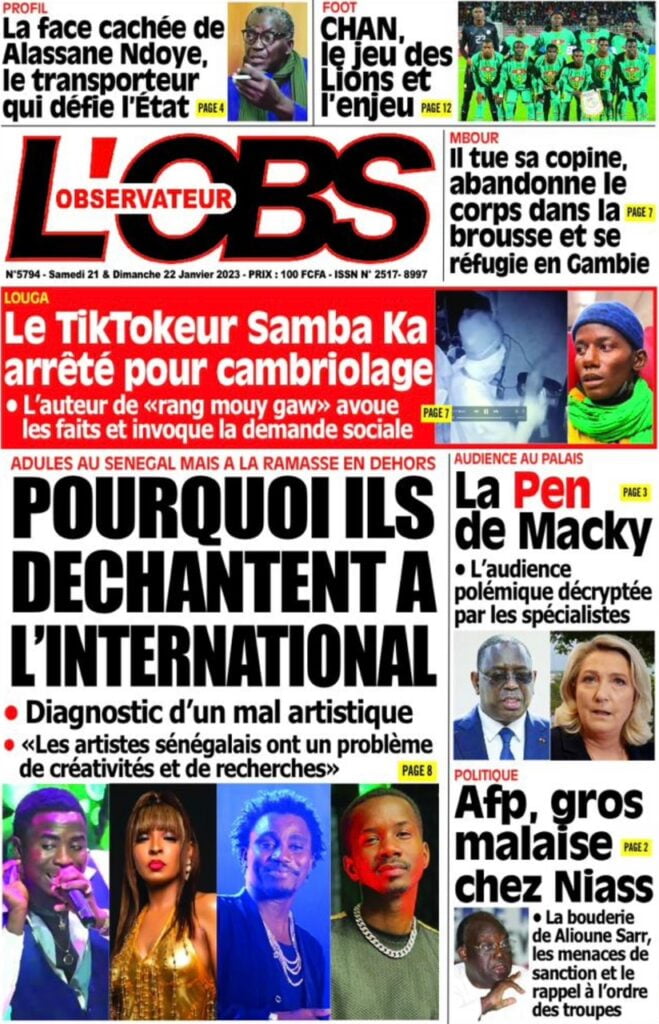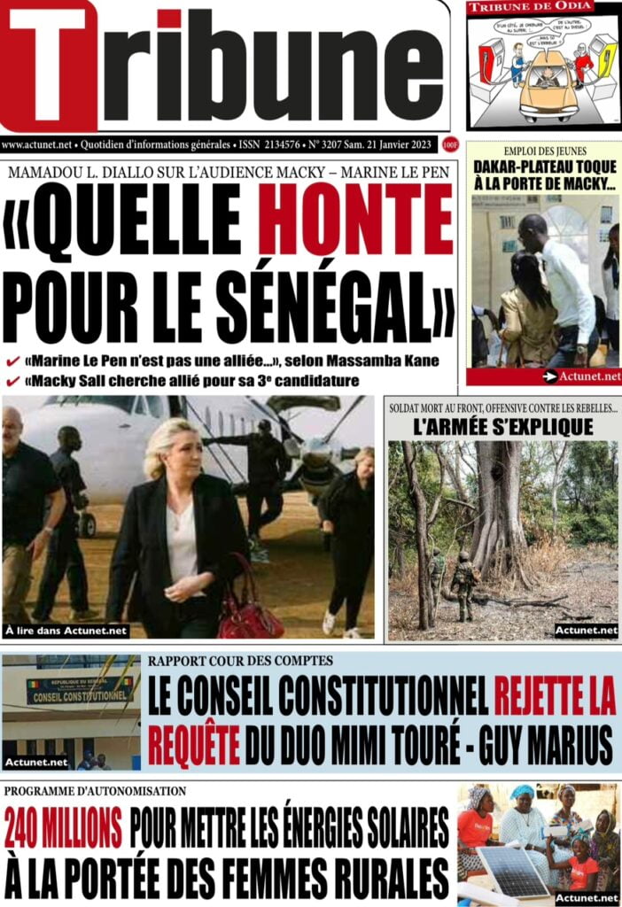 Accueil › Sénégal › Une des journaux du samedi 21 janvier 2023 Actualités Une des journaux du samedi 21 janvier 2023 Abdou Faty GUEYE 21 Jan 2023, 08:56 1 min Une des journaux du samedi 21 janvier 2023 samedi 21 janvier 2023 une des journaux Votre avis sera publié et visible par des milliers de lecteurs. Veuillez l’exprimer dans un langage respectueux. Commentaire Nom E-mail (ne sera pas visible) Enregistrer mon nom, mon e-mail et mon site web dans le navigateur pour mon prochain commentaire. Partager Partager Partager 0 Laisser un commentaire Annuler la réponseCommentaireNom E-mail (ne sera pas visible) Enregistrer mon nom, mon e-mail et mon site dans le navigateur pour mon prochain commentaire.