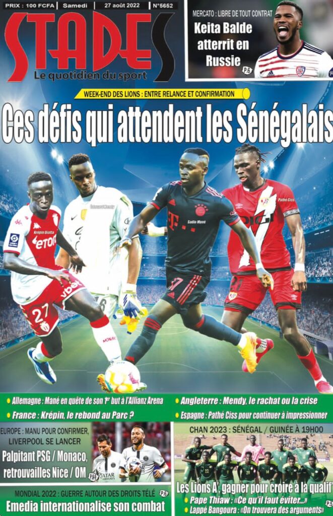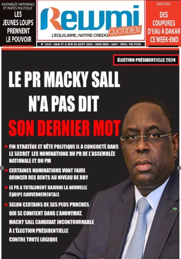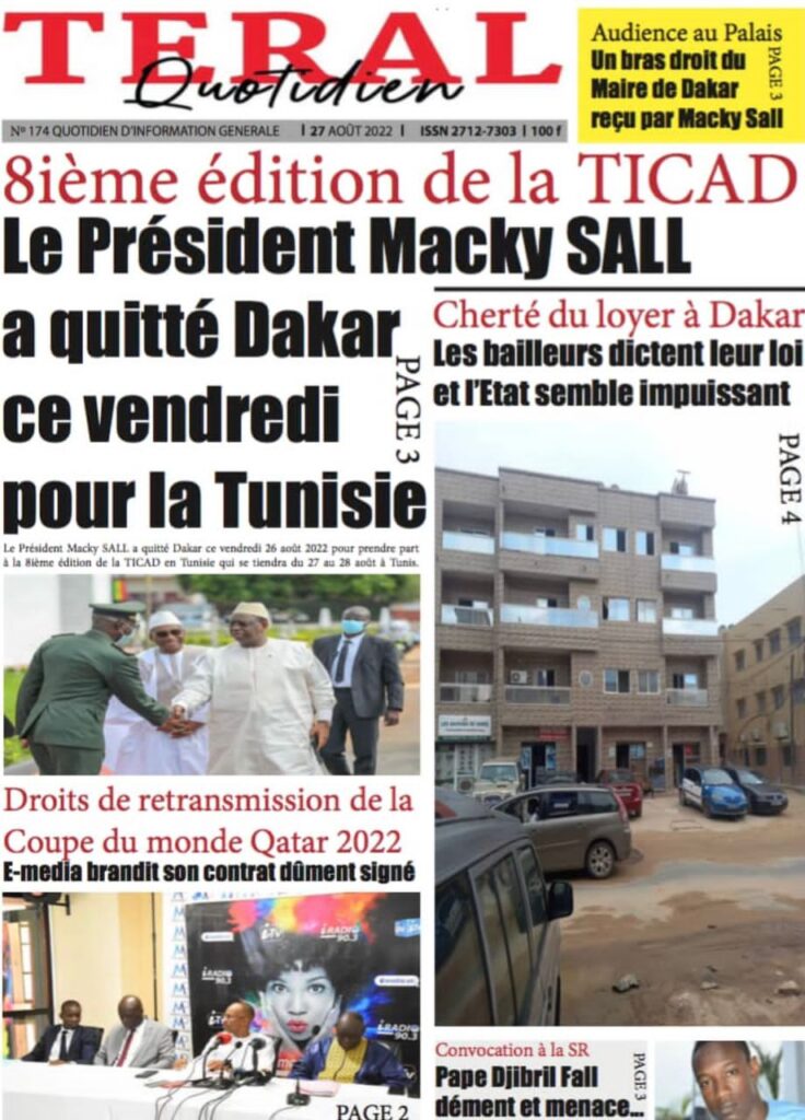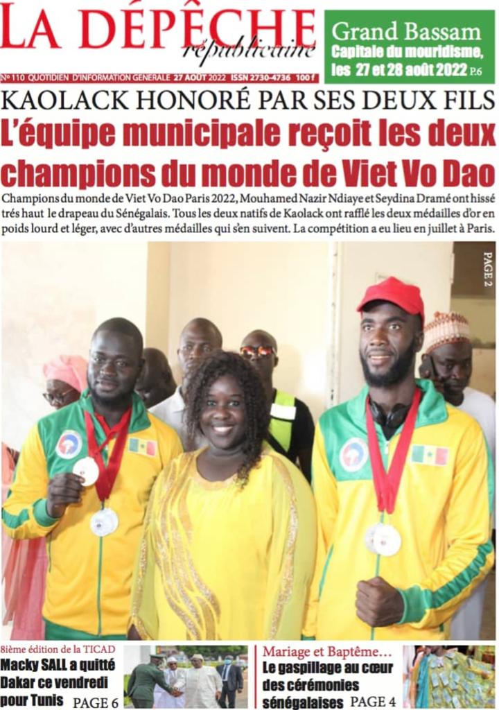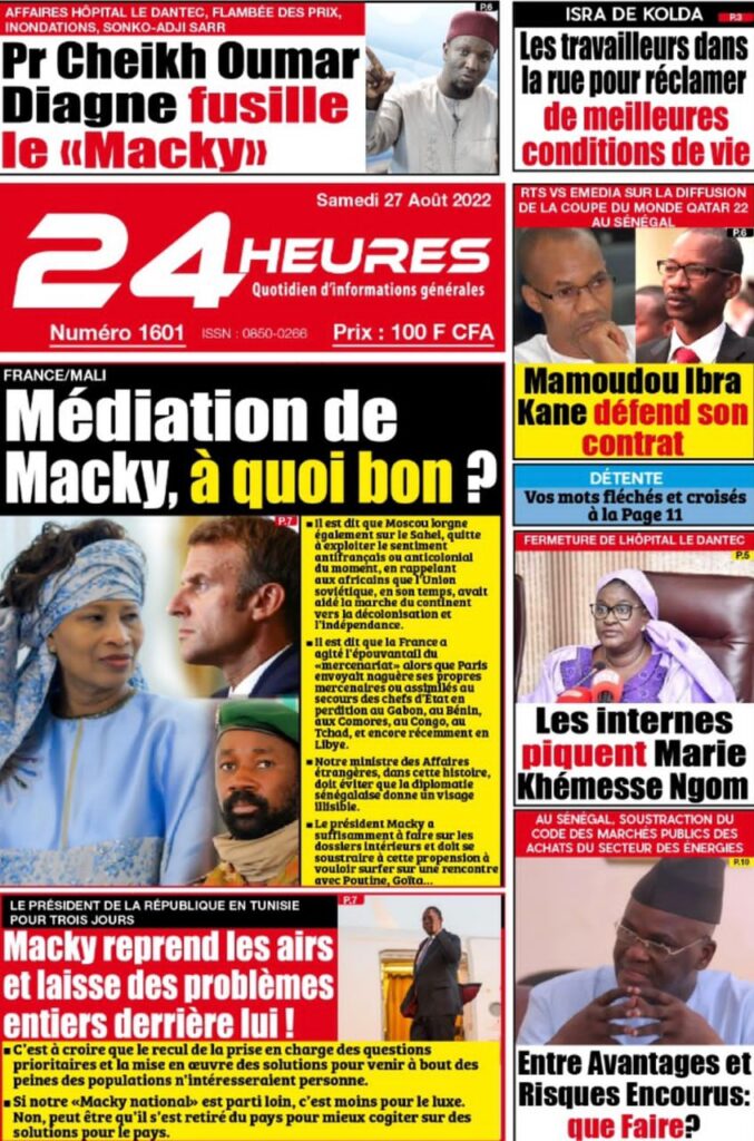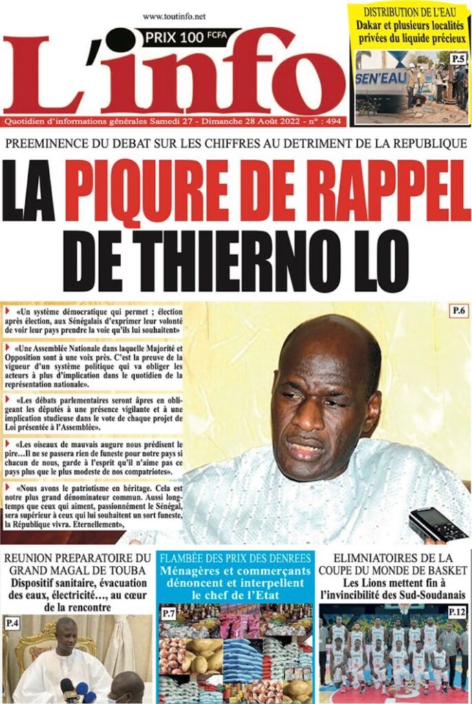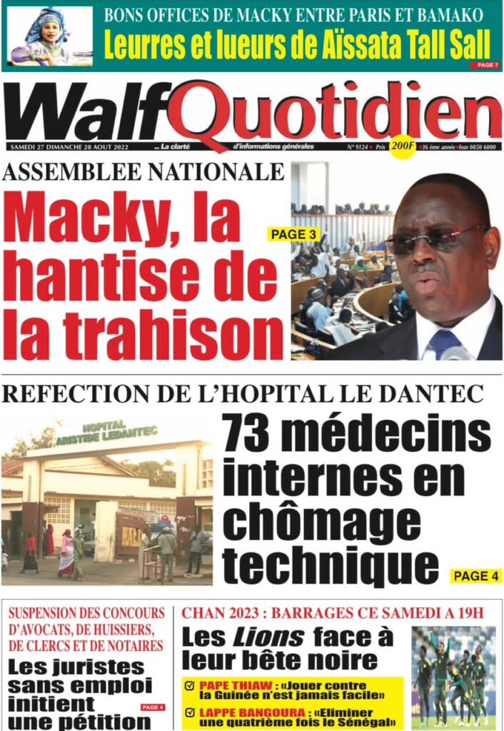 Accueil › Sénégal › Une des journaux du samedi 27 août 2022 Actualités Une des journaux du samedi 27 août 2022 Abdou Faty GUEYE 27 Août 2022, 08:36 1 min Une des journaux du samedi 27 août 2022 samedi 27 août 2022 une des journaux Votre avis sera publié et visible par des milliers de lecteurs. Veuillez l’exprimer dans un langage respectueux. Commentaire Nom E-mail (ne sera pas visible) Enregistrer mon nom, mon e-mail et mon site web dans le navigateur pour mon prochain commentaire. Partager Partager Partager 0 Laisser un commentaire Annuler la réponseCommentaireNom E-mail (ne sera pas visible) Enregistrer mon nom, mon e-mail et mon site dans le navigateur pour mon prochain commentaire.