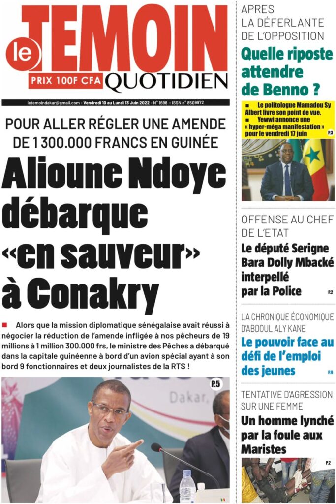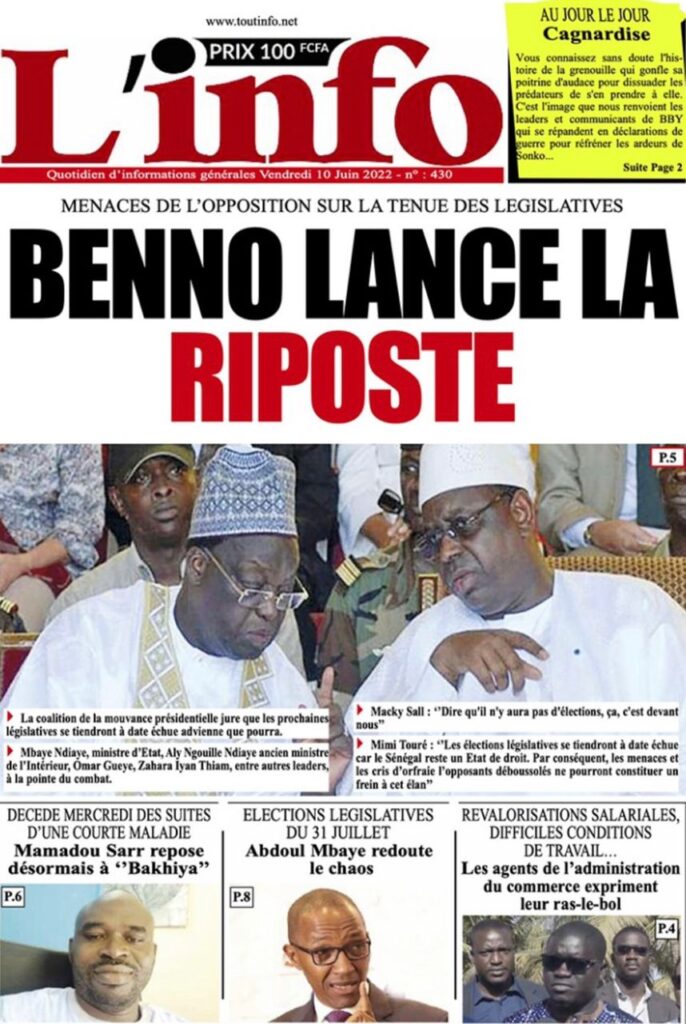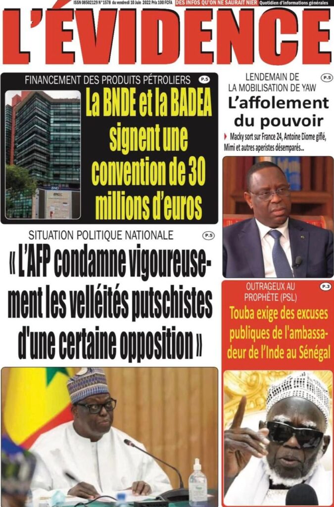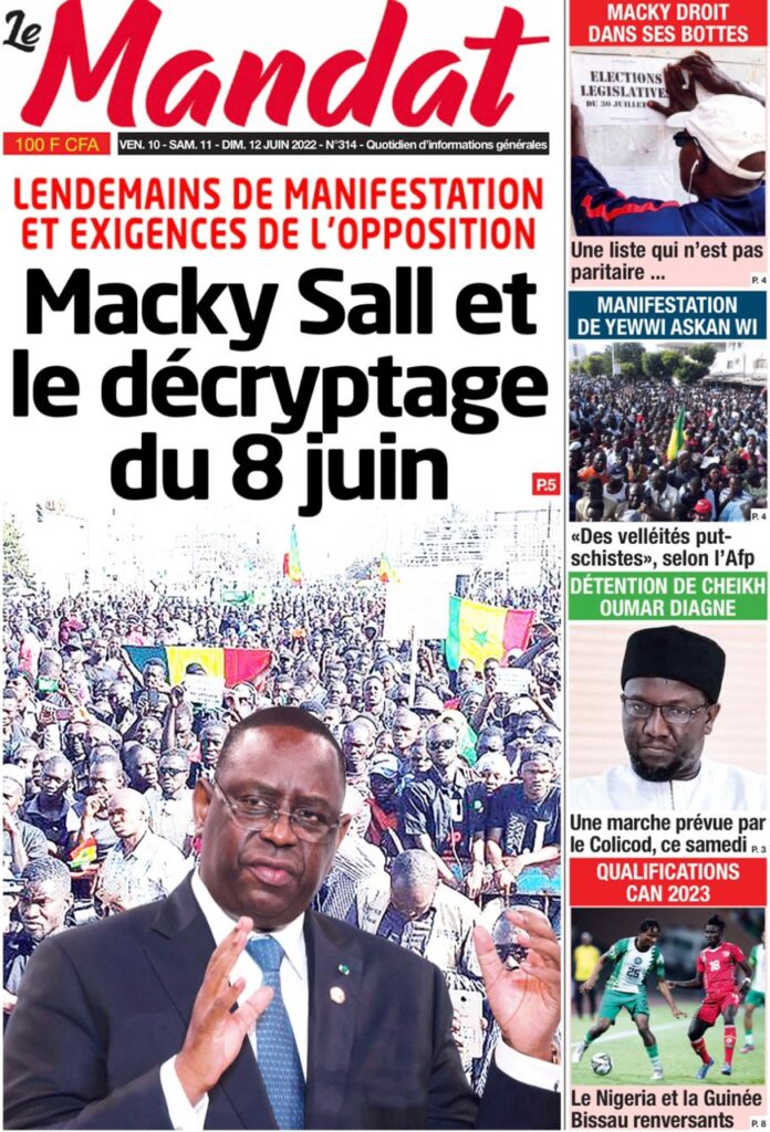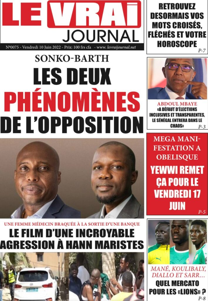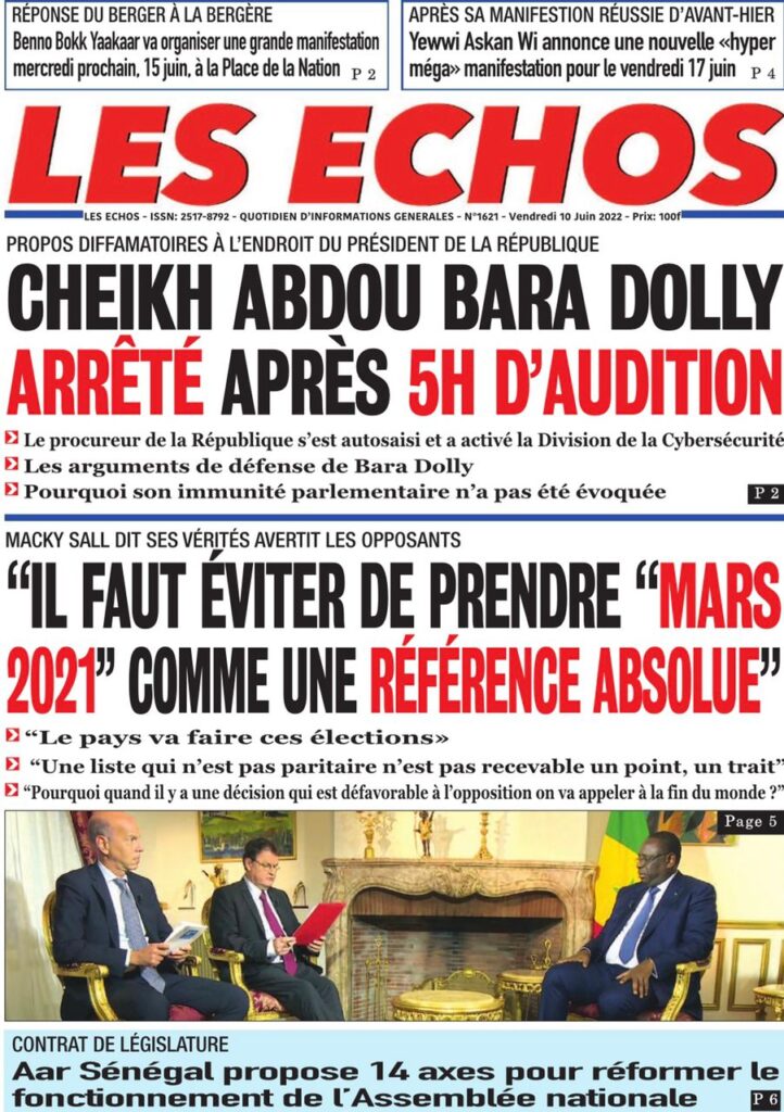 Accueil › Sénégal › Une des journaux du vendredi 10 juin 2022 Une des journaux du vendredi 10 juin 2022 Publié le 10 Juin 2022, à 07:28 par Abdou Faty GUEYE Une des journaux du vendredi 10 juin 2022 Votre avis sera publié et visible par des milliers de lecteurs. Veuillez l’exprimer dans un langage respectueux. Commentaire Nom E-mail (ne sera pas visible) Enregistrer mon nom, mon e-mail et mon site web dans le navigateur pour mon prochain commentaire. Partager Partager Partager 0 Laisser un commentaire Annuler la réponseCommentaireNom E-mail (ne sera pas visible) Enregistrer mon nom, mon e-mail et mon site dans le navigateur pour mon prochain commentaire.