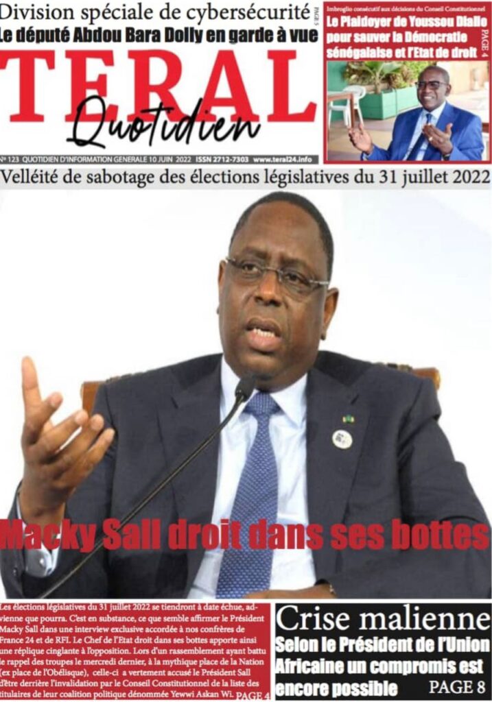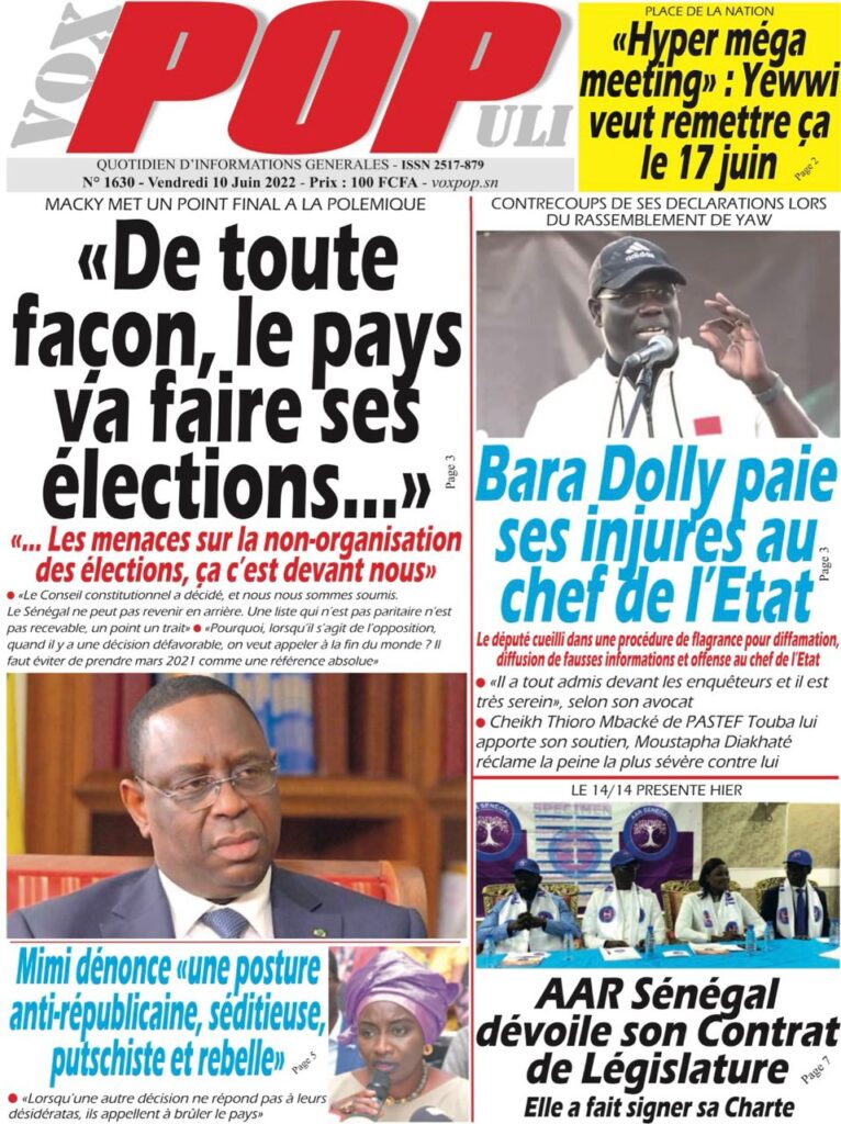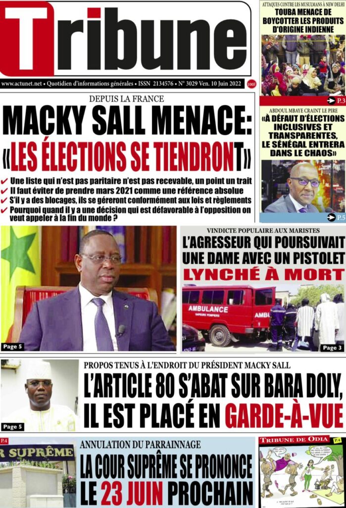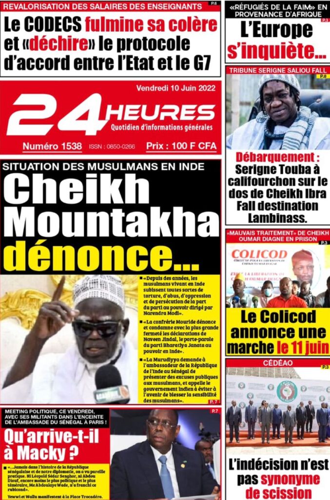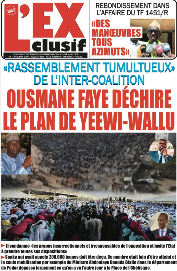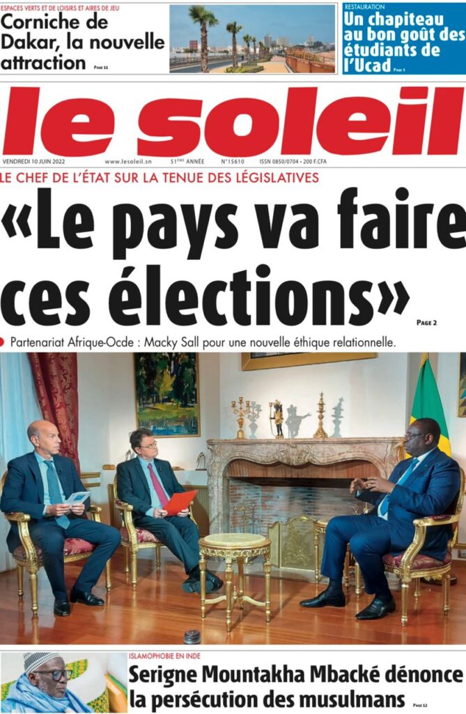 Accueil › Sénégal › Une des journaux du vendredi 10 juin 2022 Une des journaux du vendredi 10 juin 2022 Publié le 10 Juin 2022, à 07:28 par Abdou Faty GUEYE Une des journaux du vendredi 10 juin 2022 Votre avis sera publié et visible par des milliers de lecteurs. Veuillez l’exprimer dans un langage respectueux. Commentaire Nom E-mail (ne sera pas visible) Enregistrer mon nom, mon e-mail et mon site web dans le navigateur pour mon prochain commentaire. Partager Partager Partager 0 Laisser un commentaire Annuler la réponseCommentaireNom E-mail (ne sera pas visible) Enregistrer mon nom, mon e-mail et mon site dans le navigateur pour mon prochain commentaire.