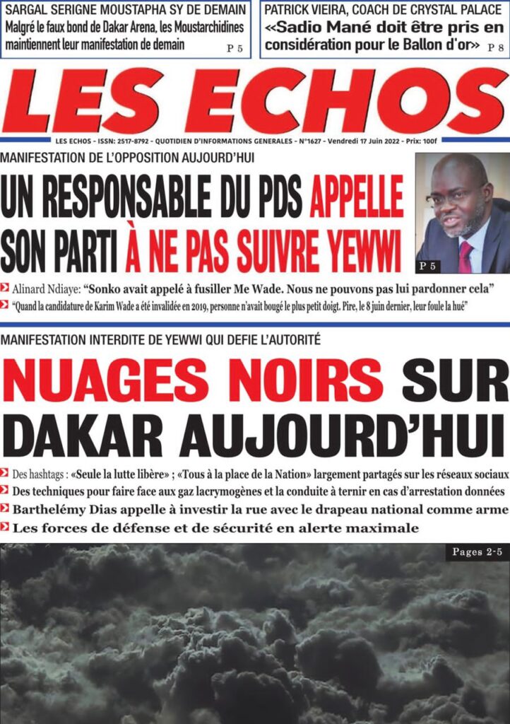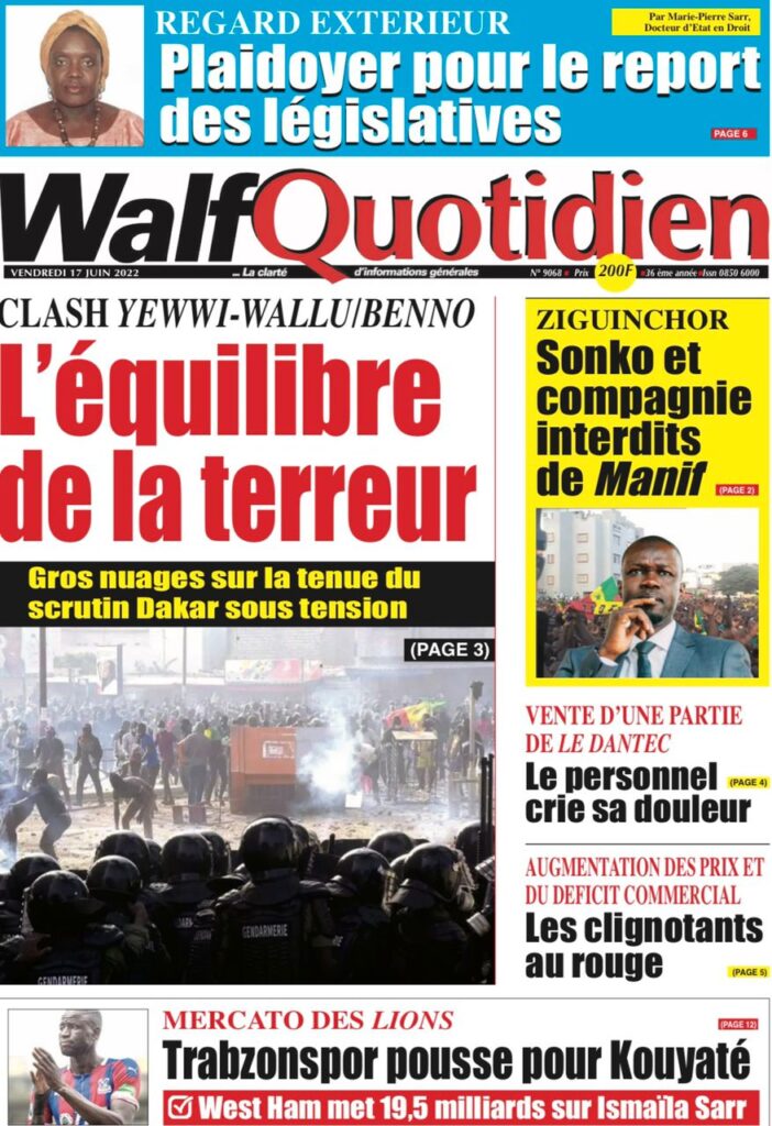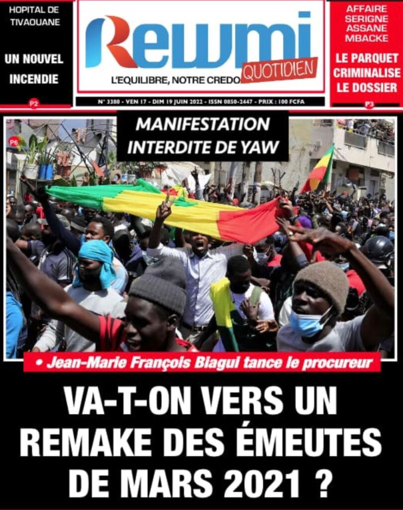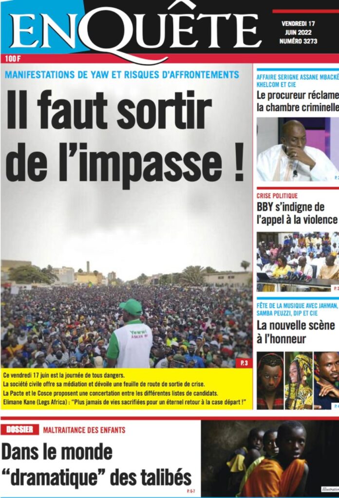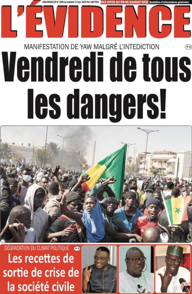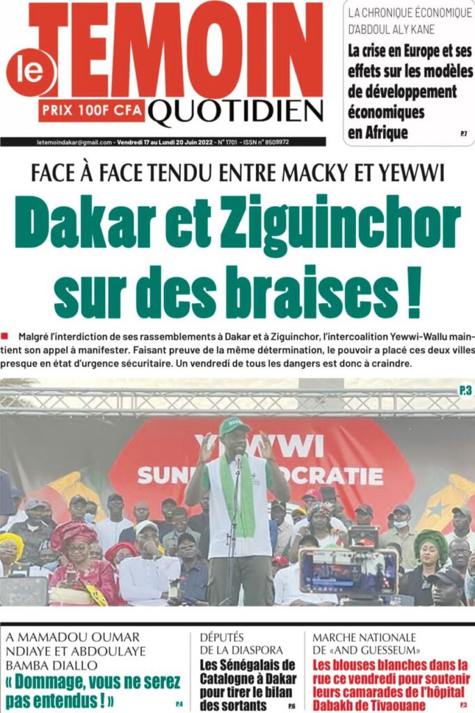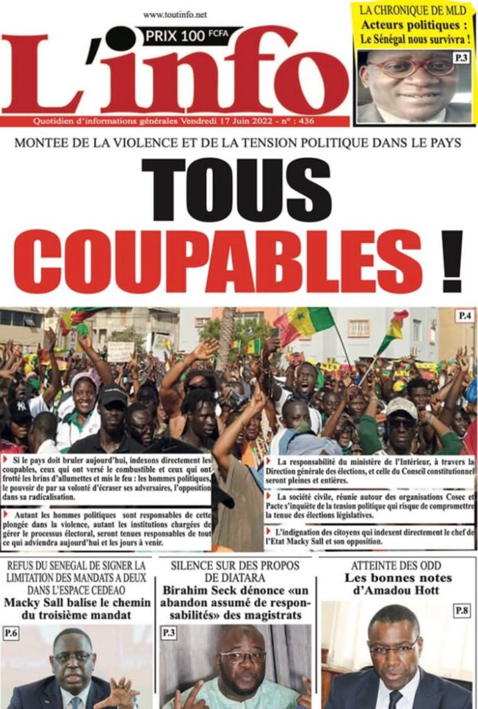 Accueil ›Sénégal ›Une des journaux du vendredi 17 juin 2022Une des journaux du vendredi 17 juin 2022 Publié le 17 Juin 2022, à 08:00 par Abdou Faty GUEYE Une des journaux du vendredi 17 juin 2022Votre avis sera publié et visible par des milliers de lecteurs. Veuillez l’exprimer dans un langage respectueux. Commentaire Nom E-mail (ne sera pas visible) Enregistrer mon nom, mon e-mail et mon site web dans le navigateur pour mon prochain commentaire. Partager Partager Partager 0 Laisser un commentaire Annuler la réponseCommentaireNom E-mail (ne sera pas visible) Enregistrer mon nom, mon e-mail et mon site dans le navigateur pour mon prochain commentaire.