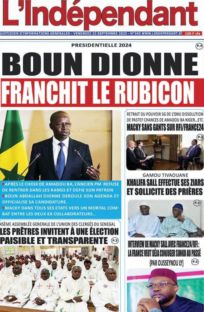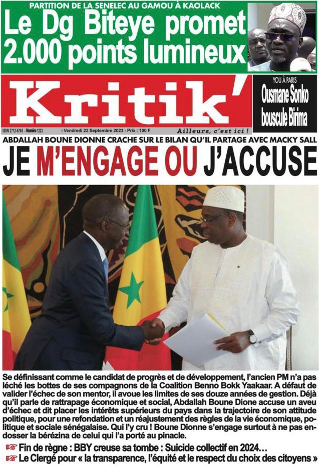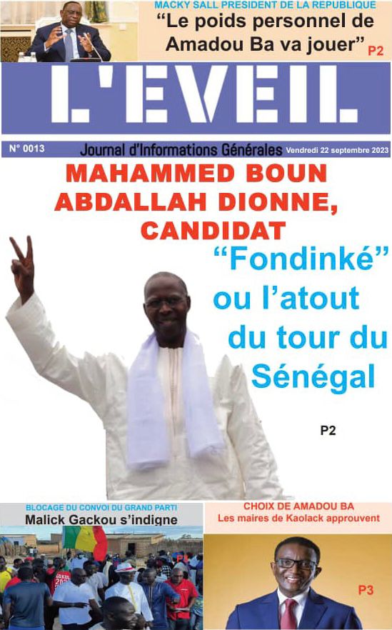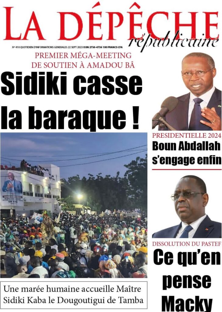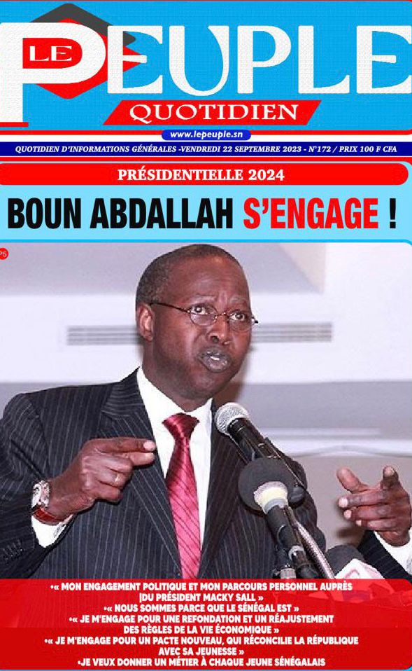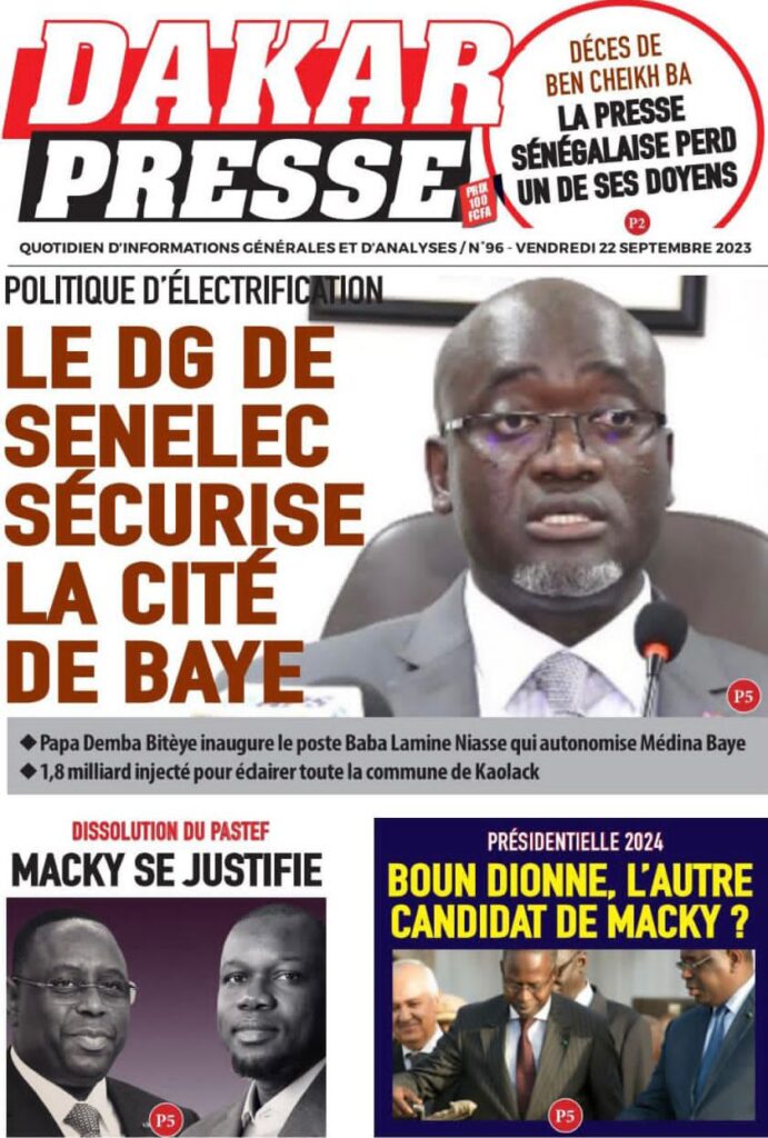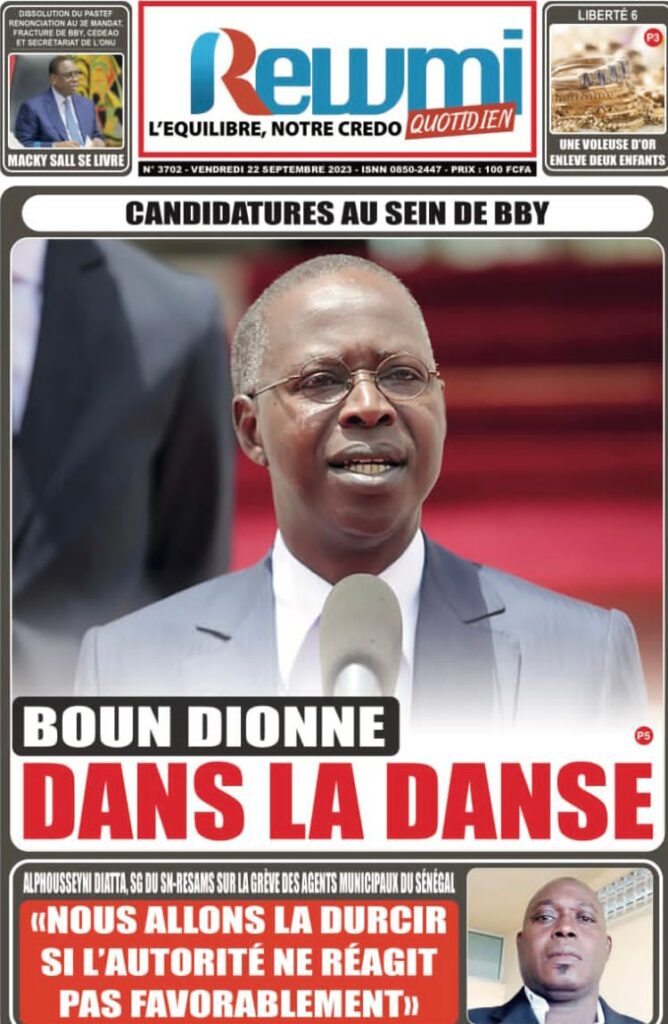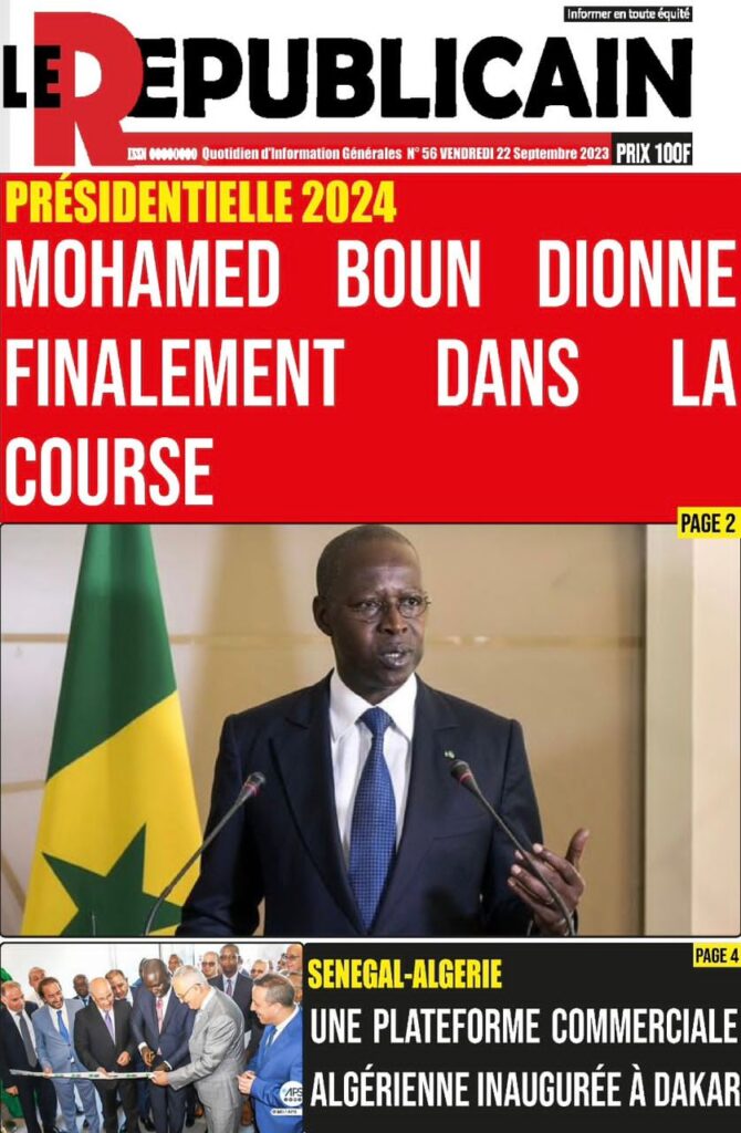 Accueil › Sénégal › Une des journaux du vendredi 22 septembre 2023 Actualités Une des journaux du vendredi 22 septembre 2023 Abdou Faty GUEYE 22 Sep 2023, 07:26 1 min une des journaux vendredi 22 septembre 2023 Votre avis sera publié et visible par des milliers de lecteurs. Veuillez l’exprimer dans un langage respectueux. Commentaire Nom E-mail (ne sera pas visible) Enregistrer mon nom, mon e-mail et mon site web dans le navigateur pour mon prochain commentaire. Partager Partager Partager 0 Laisser un commentaire Annuler la réponseCommentaireNom E-mail (ne sera pas visible) Enregistrer mon nom, mon e-mail et mon site dans le navigateur pour mon prochain commentaire.