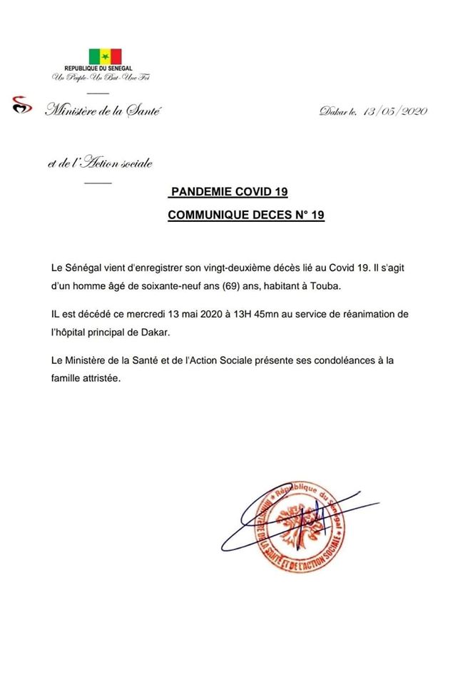 Le Sénégal vient d’enregistrer son vingt-deuxième décès lié au Covid-19. Il s’agit d’un homme âgé de soixante-neuf ans (69) ans, habitant Touba.
