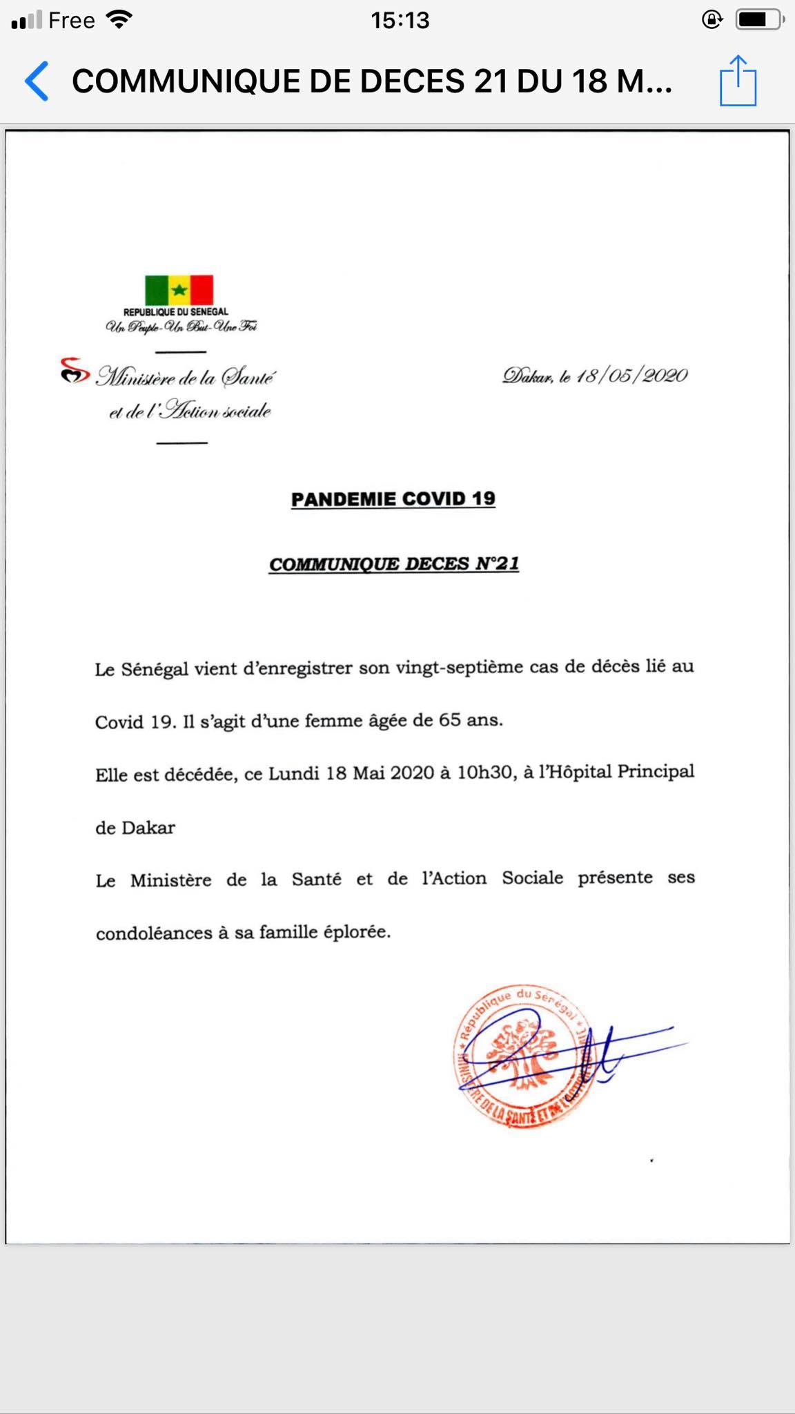 Le Sénégal vient d’enregistrer son vingt-septième décès lié au Covid-19. Il s’agit d’une femme âgée de 65 ans.