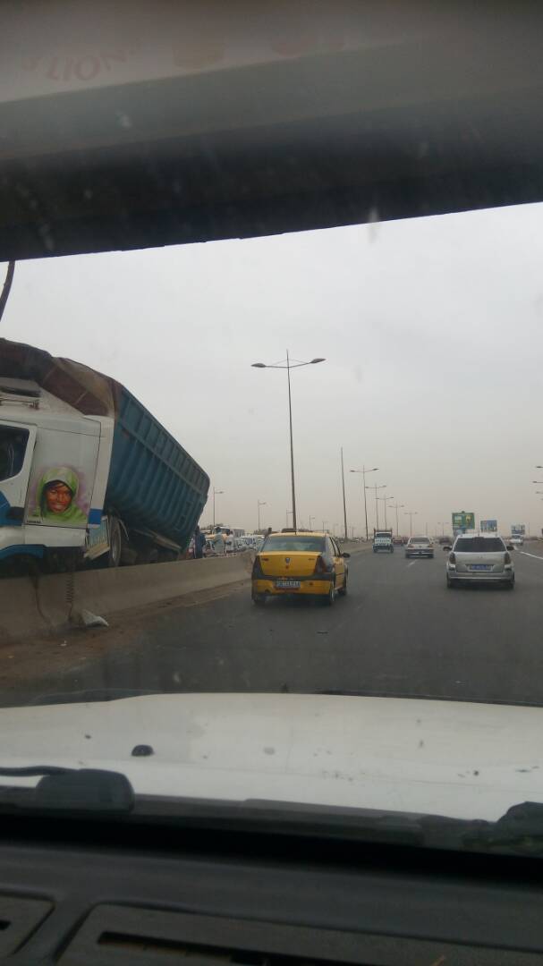 La scène s’est déroulée ce samedi matin aux environs de 10h30, à hauteur du virage de Hann qui mène vers l’autoroute. Ce camion qui venait en sens inverse a percuté de plein fouet la rampe du pont. Le véhicule est amoché.