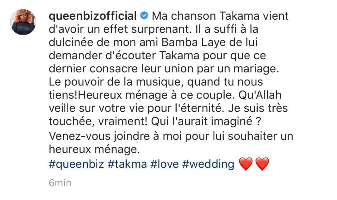 Chapeau bas à Queen Biz ! La chanson « takma » a fini par faire de l’effet. Cette femme sur la vidéo a envoyé le morceau de Queen Biz à son chéri. Et celui-ci a répondu à la demande de sa dulcinée en acceptant de se marier avec elle.