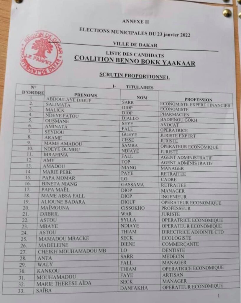 Liste des candidats de la grande coalition BBY pour la ville de Dakar…