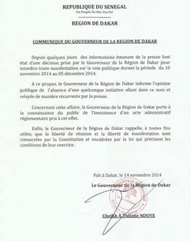 Voici le communiqué officiel du gouverneur de la région de DAKAR qui dément toute interdiction de manifestation dans la capitale du 10 novembre au 05 décembre 2014